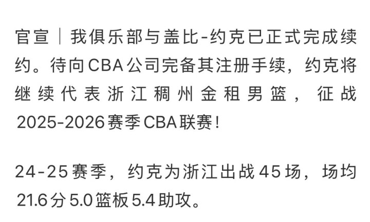 浙江男篮方面官方宣布续约了球队上赛季的主力外援约克!这次续约对于浙江男篮来说,是十分重要的,因为约克是CBA进攻效率非常高的小外援,是浙江队上赛季进入季后赛的关键核心!